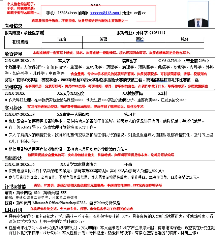 最有亮点、相关性最高的信息要放在简历最显眼的地方,建议重点突出英语、科研相关内容,科研实在没有的可以写毕设,写本科做过的实验以及掌握的实验技能、数据处理技能,专硕可以写实习轮转过的科室和学到的临床技能。