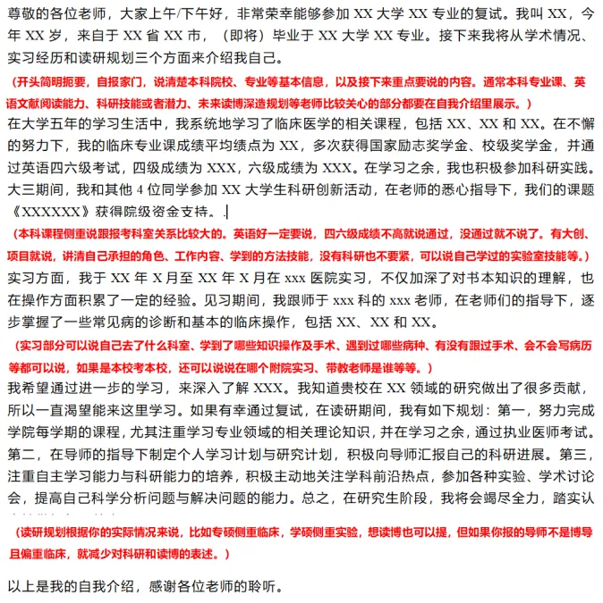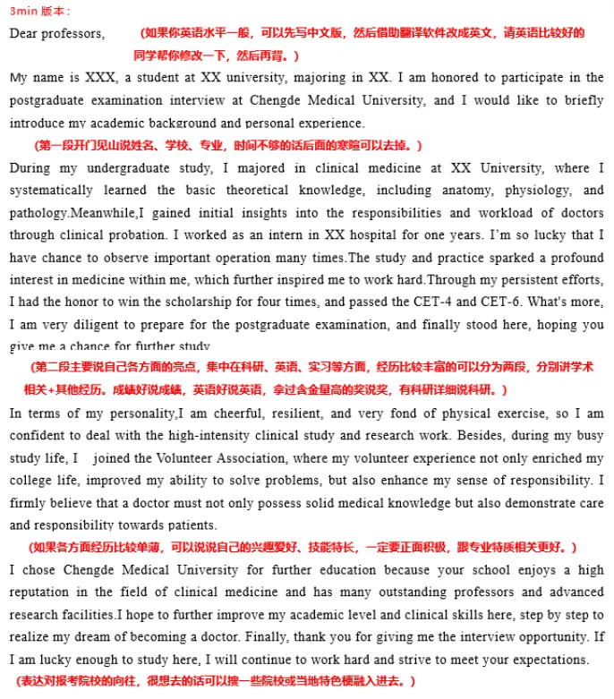 中英文版本都要准备,就算科室只要求中文/英文也准备双份,自我介绍重点准备英文版本,大概3min左右,要非常熟练。中文版本要更加注重信息准确性,注意不要跟简历内容自相矛盾。大家平时练习自我介绍时,可以对着镜子,注意调整自己的表情,不要像背书机器一样,尽量自然大方。