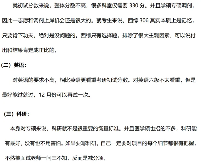 就初试分数来说,整体分数不高,很多科室仅需要330分。并且学硕专硕调剂,因此一志愿和调剂上岸机会还是很大的。就考生来说,西综306其实本质上是记忆,只要肯下功夫,绝对是没问题的。西综只有选择题,排除了很大主观因素,可以说付出和结果肯定成正比的。