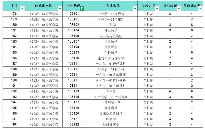 (1)名额:学硕的统招名额较少。25年所有学硕统招名额如下图。可以看到招生名额多的主要是内外科、肿瘤学。