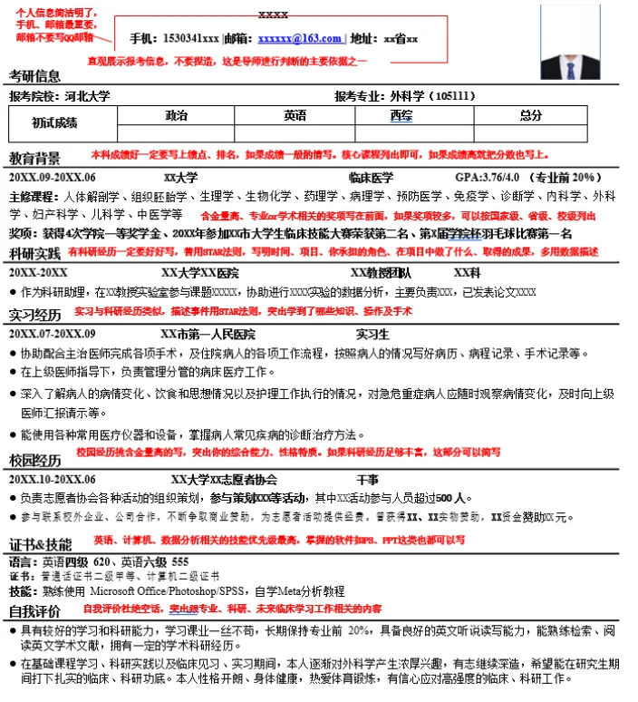 最有亮点、相关性最高的信息要放在简历最显眼的地方,建议重点突出英语、科研相关内容,科研实在没有的可以写毕设,写本科做过的实验以及掌握的实验技能、数据处理技能,专硕可以写实习轮转过的科室和学到的临床技能。