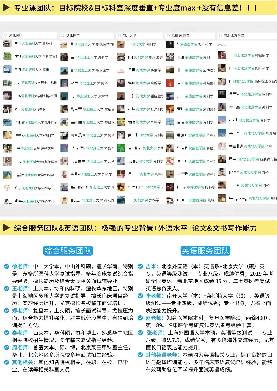 本校各个科室、各个医院,几乎都有我们各个团队的初试、复试录取学员、团队服务成员,没有什么打听不到的,所有关于本校初试、复试的相关问题,通通解决。你们可以看一下我们的通讯录截图,看一下我们资料页截图,然后看一下我们关于复试的,各项带学生的服务记录,你会发现,做本校考研初复试的团队,比我们专业的,几乎没有!!!