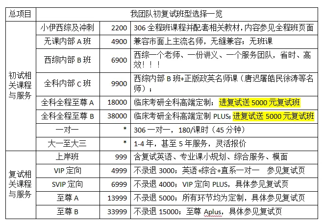 你买的不仅仅是一堆“名师课件”,而是名师、资料、课程浑然一体的一个体系,我们提供的是临床、西综全套解决方案,是有人带、有人盯,有个性化辅导的超高端西综考研班。带你的还是西综270+,总分420+的大佬!!!(根据考生情况适配,带教团队最低分不低于380)