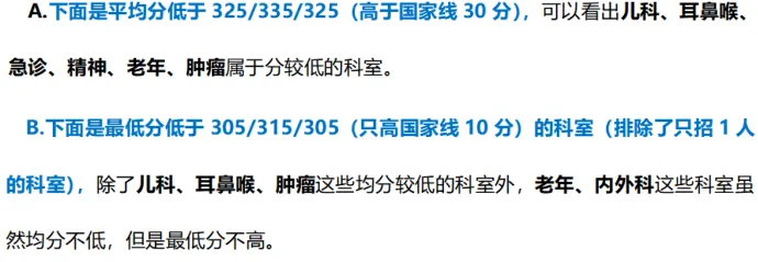 A.下面是平均分低于325/335/325(高于国家线30分),可以看出耳鼻喉、肿瘤、儿科、妇产、急诊、精神属于分较低的科室。