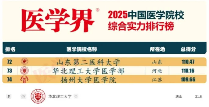 1.学院实力:2025医学界中国医学院校综合实力排行榜-华北理工大学第73名;2025软科中国大学临床医学排名第82名,学科层次B 。