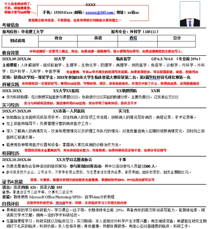 最有亮点、相关性最高的信息要放在简历最显眼的地方,建议重点突出英语、科研相关内容,科研实在没有的可以写毕设,写本科做过的实验以及掌握的实验技能、数据处理技能,专硕可以写实习轮转过的科室和学到的临床技能。