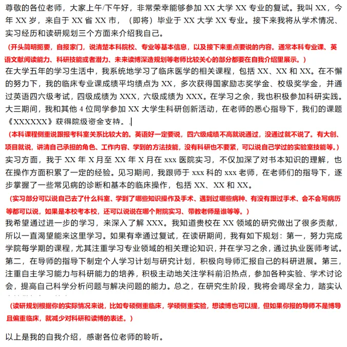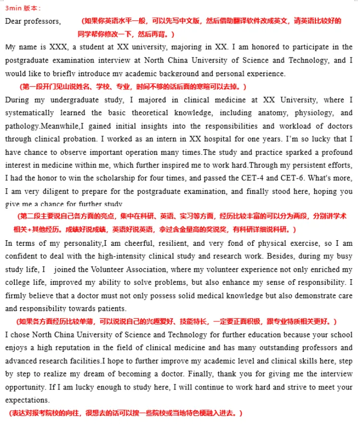 中英文版本都要准备,就算科室只要求中文/英文也准备双份,自我介绍重点准备英文版本,大概3min左右,要非常熟练。中文版本要更加注重信息准确性,注意不要跟简历内容自相矛盾。大家平时练习自我介绍时,可以对着镜子,注意调整自己的表情,不要像背书机器一样,尽量自然大方。