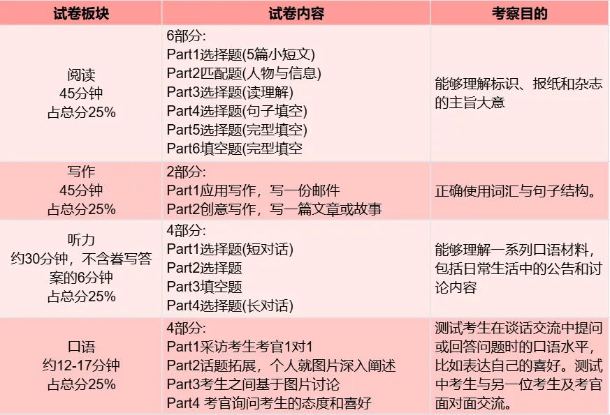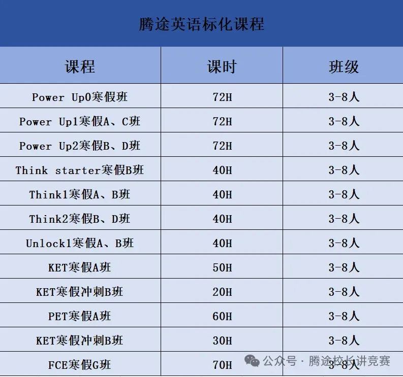 PET是剑桥大学外语考试部设计的“剑桥通用五级考试”中的第二个级别,重点考察学生听、说、读、写四项能力。近年来PET考试在小学阶段越来越火热,考位紧张已经成为常态。那么,PET到底是什么?为什么要考PET?PET考察什么内容?下面就跟着郭老师一起来看看吧!PET是剑桥大学考试委员会(Cambridge Assessment English)设计的国际英语认证考试,对应欧标B1水平(雅思4.0-5.0),是剑桥五级证书考试(MSE)的第二级。通过PET,孩子将掌握日常交流、旅行沟通、基础学术表达等实用英语技能。升学竞争力强:在国内部分城市的小升初阶段,PET证书是重点学校、英语实验班或国际学校招生的重要参考依据。许多学校将PET成绩作为筛选学生的条件之一,尤其在评估学生的英语综合能力时,PET证书能直观反映学生的听说读写水平。留学申请优势:对于计划出国留学的学生,PET证书可作为英语能力的补充证明。在申请英联邦国家或北美国家的学校时,PET成绩能帮助学生证明其具备基本的英语应用能力,部分学校甚至将PET作为入学语言要求之一。能力提升与衔接:PET考试全面考查听、说、读、写四项技能,注重实际语言运用能力的培养。通过备考PET,学生能系统提升英语综合能力,为后续学习更高水平的英语考试(如FCE、CAE等)或国际标准化考试(如雅思、托福)打下坚实基础。国际认可度高:PET是剑桥大学考试委员会设计的剑桥通用英语五级证书考试的第二级,对应欧洲语言共同参考框架(CEFR)的B1水平。该证书在全球范围内被广泛认可,是国际通用的英语能力证明,可作为英语水平的权威凭证,适用于留学、就业、学术交流等场景,证书终身有效。内容:涉及学校生活、家庭、社会现象、文化现象等方面。考察对说明文、议论文、应用文等各类文本内容的理解。如:从指示牌、便条、明信片等文本中提取信息,回答问题。内容:第一部分为邮件回复;第二部分选择短文或故事进行写作。两部分对字数要求都为100字。涉及学校、家庭、工作、社交场合等多个场景,形式含日常对话、演讲、采访、广播等。 第一部分回答事实或个人信息问题;第二部分根据提供的图片讲述内容;第三部分考生根据图片或考官描述的情境进行对话;第四部分考生单独回答或考生间互动讨论爱好、习惯、经历等话题。针对想要备考PET的学生们,腾途教育特设PET寒假培训课程,针对不同年龄的不同学习阶段的重点内容为基础,系统地学习国际英语标化的知识体系,并带领学生提升英语水平!班级设置:3-8人小班/1对1