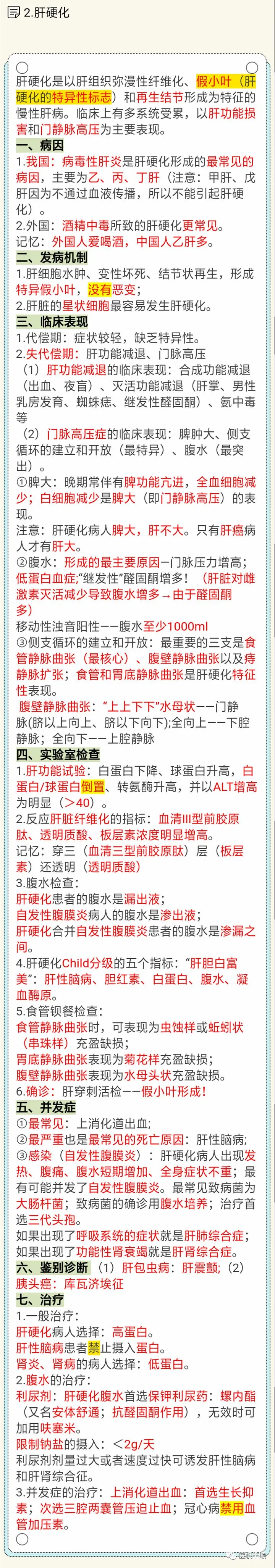 4.肝硬化病人一定要高蛋白饮食(肝性脑病禁止摄入蛋白)。