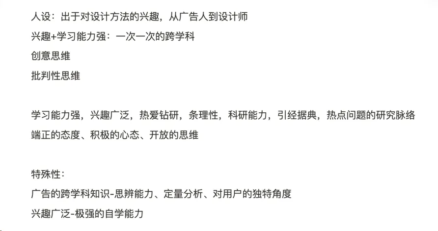 首先给大家提供一个整体构建思路,可以对应着填入自己的信息。综合能力:逻辑、沟通、团队合作、系统思维、英语水平、学习能力等选择报考院校、专业原因(跨专业的也需要包括跨专业的原因)老师会通过面试相关的一些内容,去考察你上述的背景、能力和规划是否属实,以及了解一些更加深入更加具体的内容。先来整体性的阐述一下大概的人设构思的思路。以我自身为例,将我的个人信息对应输入到上面的架构中,本科是广告学专业的学生,然后想要跨考前往交互设计。这就是一个最平铺直叙的大致背景。那么之后我会做的就是来分析自己的优劣势,对自己进行一个SWOT分析。相对于本科学习设计的学生,没有足够的技术能力、设计能力广告学专业背景,擅长用户调研、广告传播、市场营销,具备足够的创意思维和商业思维从课程项目经历和实习经历上都有足够证明自己专业能力的例证(后续可转化为作品集项目)学习能力强,自学了视觉设计,具备了基础的交互设计知识和设计思维其次是结合同济老师们会关注、感兴趣的部分,提取出自己的独特之处,进行人设定位,作为向老师“孔雀开屏”的重点。人设打草稿:不要脸地把所有可以编成是自己优点的词都列了出来这里我就进行了自己人设的设计,并在作品集中用一句话表达了出来。I am an ADVERTISER who is transforming into a DESIGNER ,with a great passion for Design Thinking & Design Methods.我是一个广告人,这个就是我的第一重人设,也就是我具备相当出色的本科能力,可以设计学科带来不一样的跨学科思维。然后说我对设计思维和设计方法有很高的热情,不管是已经通过本科的选修课学习、自学、考研而得到的初步认知也好,还是在在未来学习设计思维和设计方法的规划,都是表明我对设计的核心认同点。👉 题外话:在这里需要注意的一点就是你如果在这里去设定了某一些比较重点的问题,比如说我设定是我对设计思维和设计方法非常的感兴趣,那就意味着你必须得在面试前有对这一方面的回答有足够的准备。老师必然会好奇,你为什么把设计思维和设计方法单独罗列出来作为你感兴趣的重点,你的理由是什么,你对它们的了解有多少,是真的热情还是只是嘴上的漂亮话而已。这些就随着你的人设的标明,成为了重要的问题。