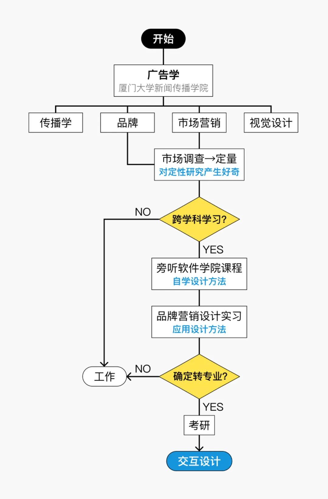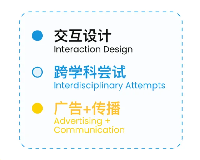 这里可以看到我对简历中的内容进行了标签的可视化,让老师对内容的分类可以一目了然。由于同济设计非常关注跨学科思维,对跨学科的同学们一向非常欢迎,所以我将这一部分单独罗列出来。需要注意的是,欢迎跨学科不代表来者不拒,而是希望我们在本科背景不同的同时,可以共聚在设计过程中,互相分享专业知识,用不同的专业能力共同推进设计,博采众长。这意味着要求有过关的本专业素养,同时具备一定的设计基础,甚至还需要有对跨学科的认知与经验。那我在编辑这一部分的内容的时候就额外注意到,不能从广告学的角度来编辑自己的简历,而是要从交互设计的角度来对项目描述进行加工。例如突出强调每一个项目中的用户调研和数据分析可视化等部分,表明对设计流程的充分认识。那这一部分没有特别多好注意的点,就是选取最精华最有代表性的经历和成果,进行原先专业能力的展示。这是因专业而异的。由于我是从广告学跨专业到交互设计,其契机是本科期间去软件学院进行相关设计课程的旁听,那么这样子一个契机以及后续的转变过程,其实恰恰可以体现我的本科能力、自学能力和对设计的热情。因此在最终提交的简历资料上,我还额外设计了一个流程图,对这一过程进行了可视化。通过作品集里的项目,无论是实际内容抑或是视觉效果,向老师展现我们的能力。那我们想向老师展现什么能力其实就决定了我们应该选择哪些项目。以我自己为例,我在上面已经列出,我想要展现的能力包括:本科专业能力/基础设计能力/与报考专业-交互设计相匹配的能力/综合能力:逻辑、沟通、团队合作、系统思维、英语水平、学习能力、前沿视野等那么根据这些元素,首先前两个项目我是以两套快题开始,基本上从零DIY了两个交互设计的项目,这里就是为了展示第2、3项能力。