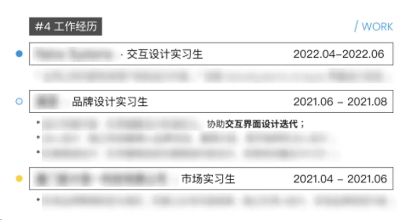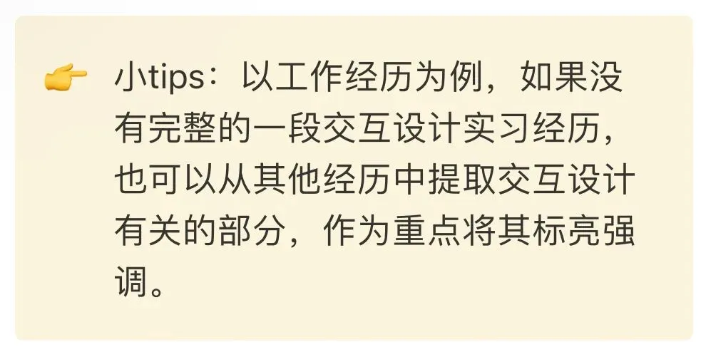 那么接下来,就需要通过简历、作品集和面试的准备,全方面落实这一人设。对于简历,根据设定好的人设和真实经历,我将其主要分为三个部分由于报考的是交互设计,那么理所当然老师们关注的第一重点必然是围绕交互设计的,所以我努力从我的各方面经历中提取了和交互设计相关的部分。