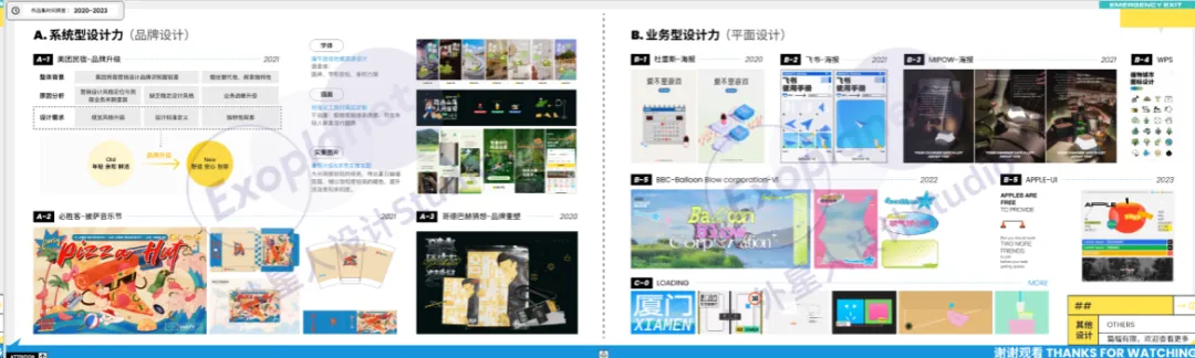 开开学姐个人作品集内页↑最后是第四个项目,这里又是一个大胆的决定。我选择了一个web3项目,在其中主要放了交互设计和区块链技术相关的部分,目的是向老师展示我对新兴领域的好奇心和探索精神,以及增添一些些我对技术的运用。除此之外,为了展示更多的综合能力,我也用一页的篇幅放了自己的otherworks,主要包括品牌设计、视觉设计等。这就是我对自己作品集的安排。可以看到,我有选择性、有针对性的通过不同的项目展现自己不同的能力,同时还进行了一些小小的偷懒:展现不同的能力意味着我只需要重新做两个交互设计方案而不是四个……(不建议学习:跨专业的同学可以通过设计项目同时展现本科能力和报考专业能力是最好的)