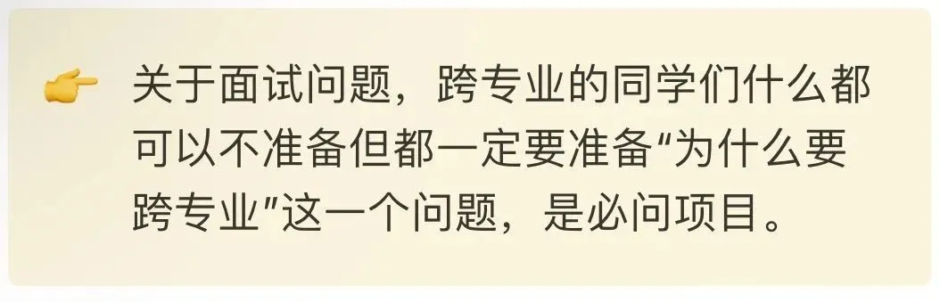通过面试问题的回答就可以在现场把人设立在老师们心中,让你的形象足够鲜明,让老师感受到独特、有趣、有价值,是我们需要通过面试模拟不断锻炼的。人设不是伪装,而是深入剖析真实自我之后,打破再重组。这是从本科跨越到研究生每个人都会面临的挑战,离开熟悉的环境,来到新的旷野,老师们需要知道,从一程赶往下一程的我们,不是茫茫然在草丛中找不到方向的小虫,而是知道自己有什么,知道自己想要什么的坚定旅者。