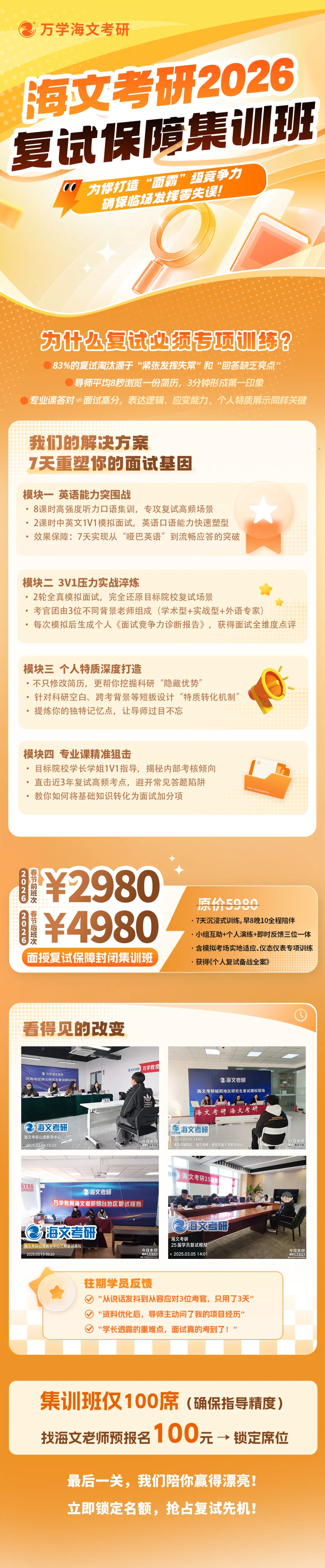 口语流利度优先:准备好1-2分钟的英文自我介绍(突出学术兴趣、相关经历、报考动机),并熟练到能自然表达。
