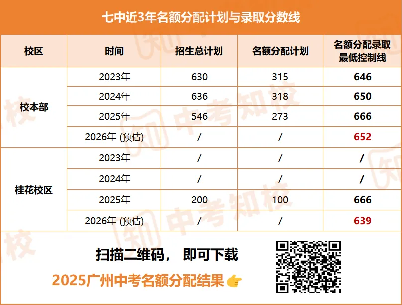 ②通过近三年名额分配录取最低分数线的情况,预估在2026年七中校本部最低录取控制线为652分,桂花校区最低录取控制线为639分。