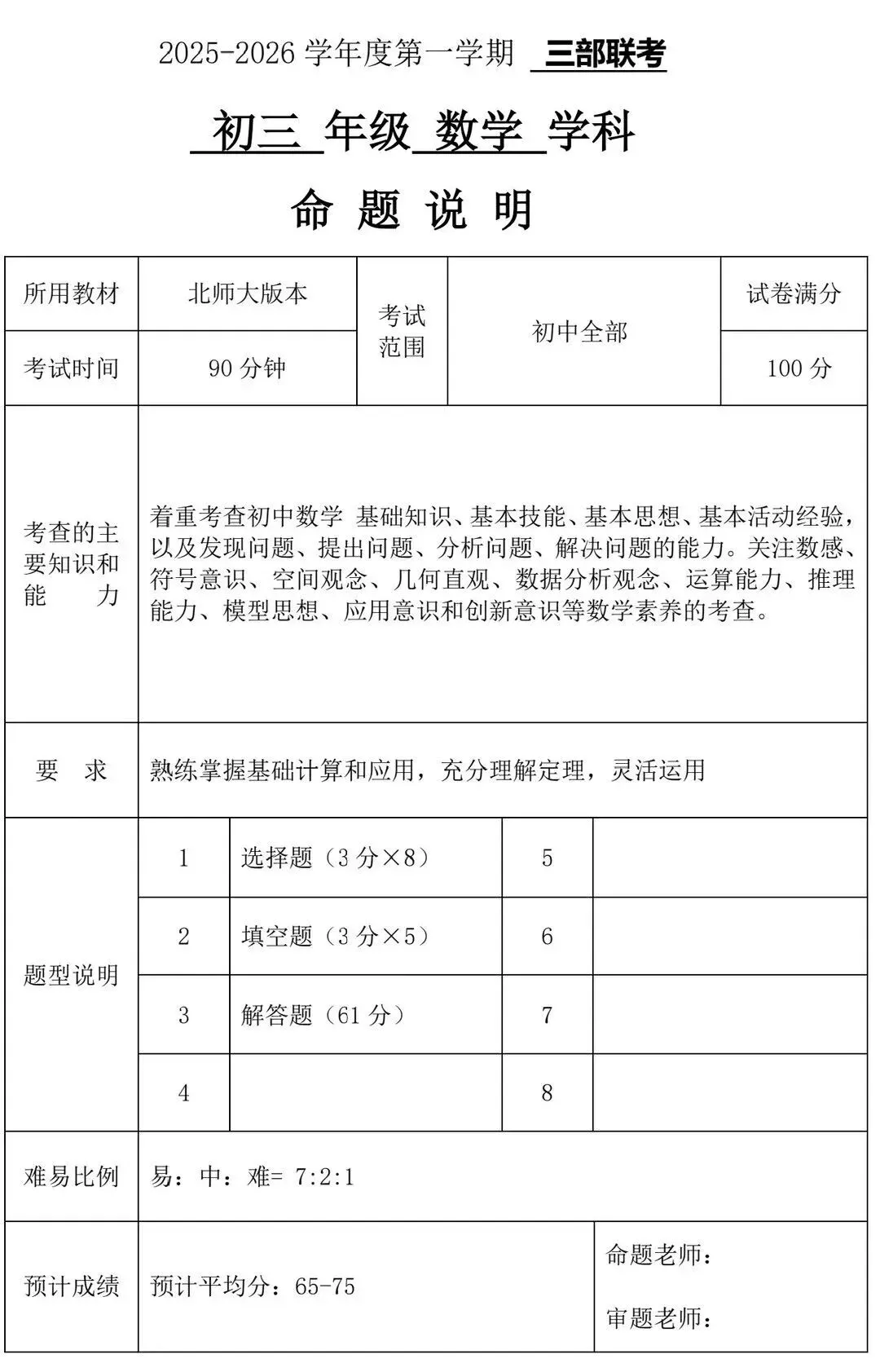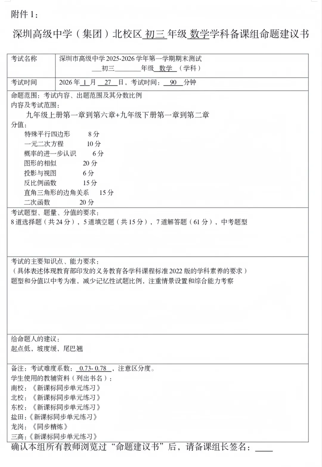 先和大家同步目前掌握的信息:深实验的语文、数学、英语 考试范围已明确。数学科目的考试时间已确定为 2026年1月27日。考试范围将涵盖 九年级上册第1-6章及下册第1-2章 的全部内容。