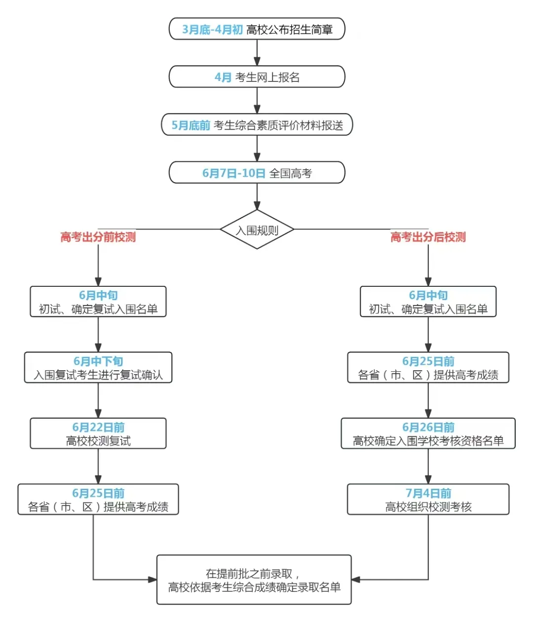简章发布→网上报名→初审名单公布→参加高考→参加校测→拟录取名单公布→志愿填报。