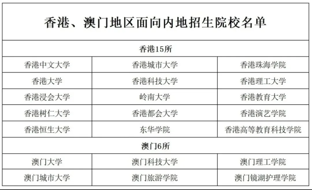 截至目前,港澳地区大学在内地招生的高校共有21所(香港15所、澳门6所)。名单如下: