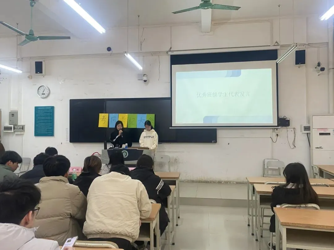优秀班级学生代表25鉴定4班两位学委分享了班级考勤和诚信备考的经验做法,呼吁全体同学共同维护考试公平,发在场师生对学风建设的深刻思考。