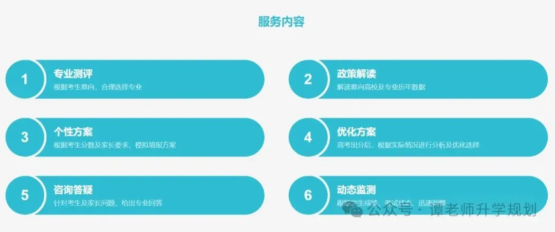 普通类高考志愿、艺术类高考志愿、新高考选科规划、综合评价、强基计划、港澳院校申请、公费师范生、免费医学生、少数民族预科、民族班、各类专项计划、军警公安院校、政法消防院校、空军招飞、海军招飞、民航招飞、高职单招、特殊类招生等多方位升学规划服务项目。