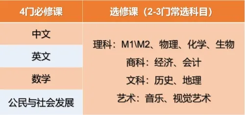 DSE考试分为核心科目和选修科目,考生需至少选考4门核心科目+2门选修科目,满足高校录取的基本要求: