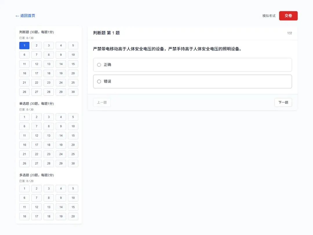 4.模拟考试功能:判断题30题(30分) + 单选题30题(30分) + 多选题20题(40分) = 总分100分,考试时间90分钟,页面左侧展示不同题型和对应的题号,答过后题号变为绿色,右上角是交卷功能