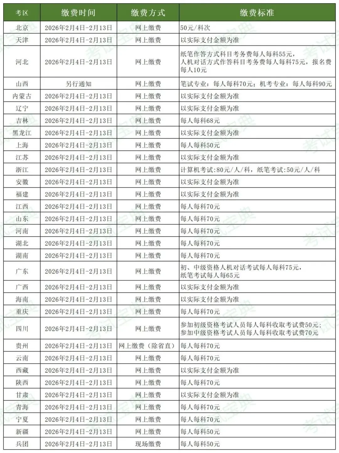 部分考区缴费标准标注 “以实际支付金额为准”,考生缴费时需以报名系统显示的金额为准,如有疑问可咨询当地考点工作人员。