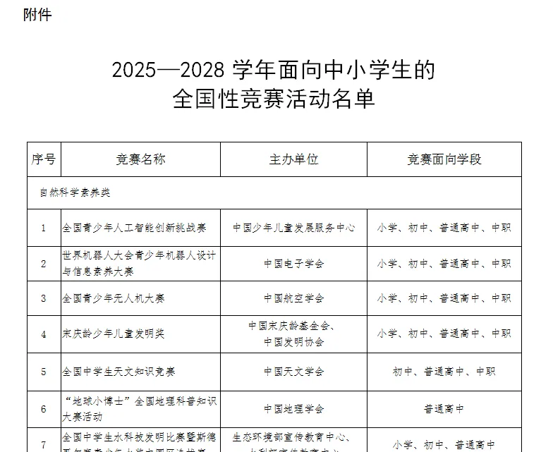 私信回复【学段 + 赛事】免费领取2025—2028学年面向中小学生的全国性竞赛活动名单