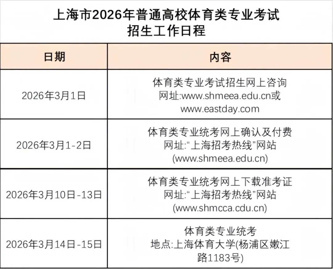 2026年1月初,考生可通过“上海招考热线”网站(www.shmeea.edu.cn)自行下载《上海市2026年普通高校考试招生体育类专业考生报考指南》,以便了解体育类专业考试招生相关信息及体育竞赛规则。