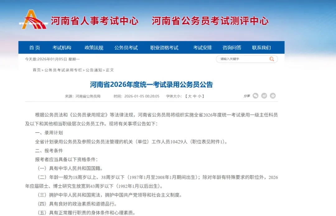 河南省2026年度统一考试录用公务员公告发布!