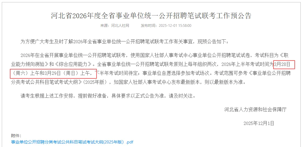 按照2025年上半年事业单位联考招聘情况,多省公告在春节前就发布了,2025年3月29日笔试,现在河北定于2026年3月28日笔试,都是周六笔试,广西想必也如此,小志预计今年春节前也会陆续发布公告。具体招录时间以官方为准,请各位小伙伴保持关注。