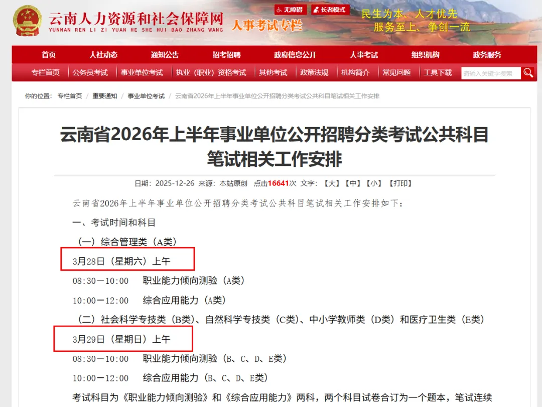 云南省2026年上半年事业单位公开招聘分类考试公共科目笔试相关安排出来了