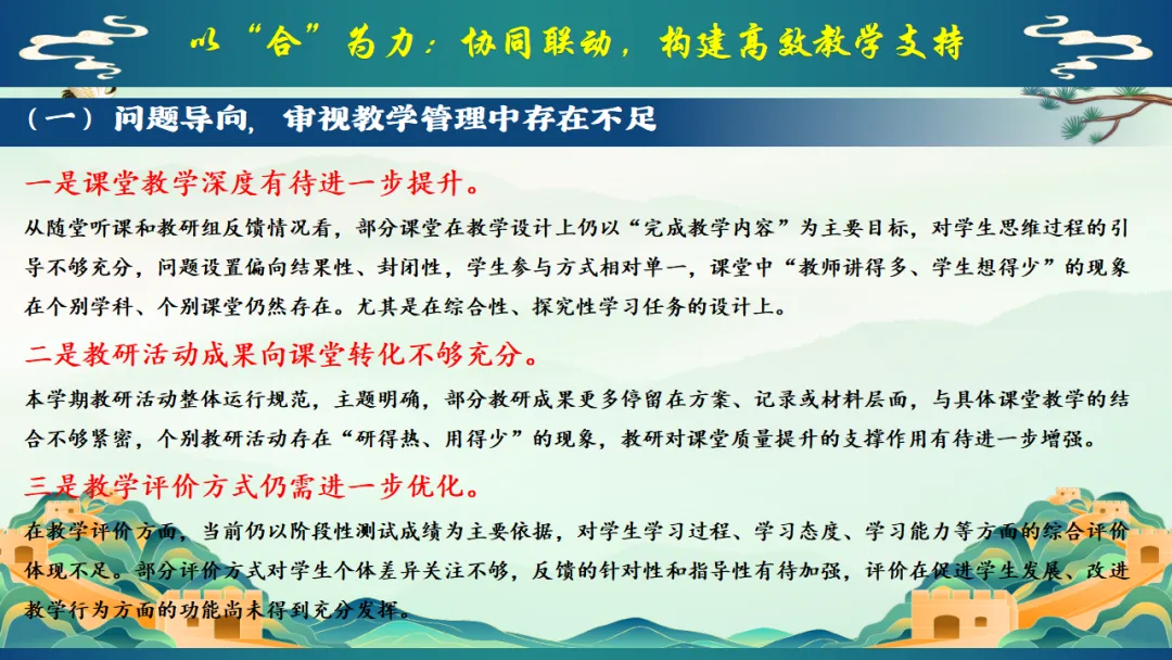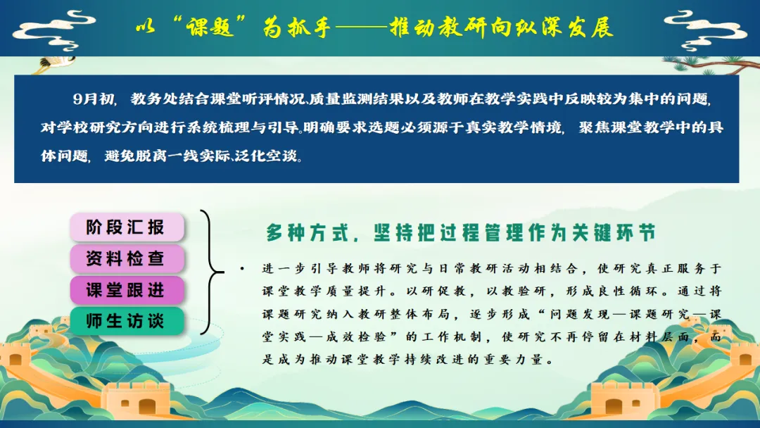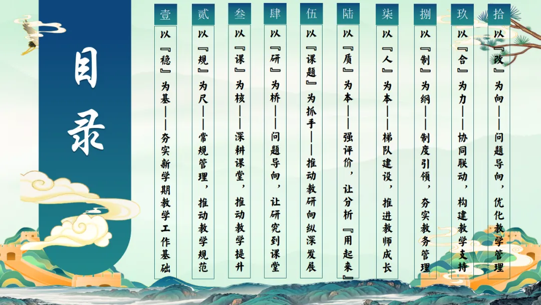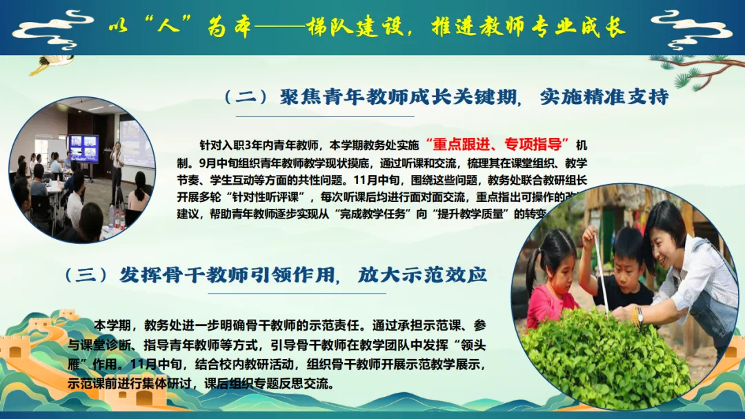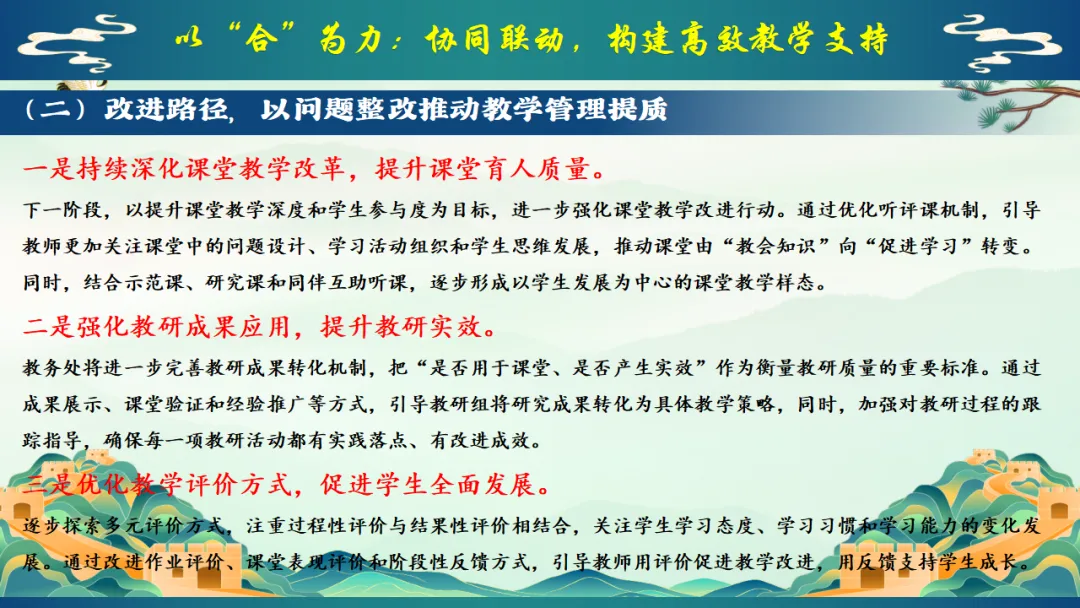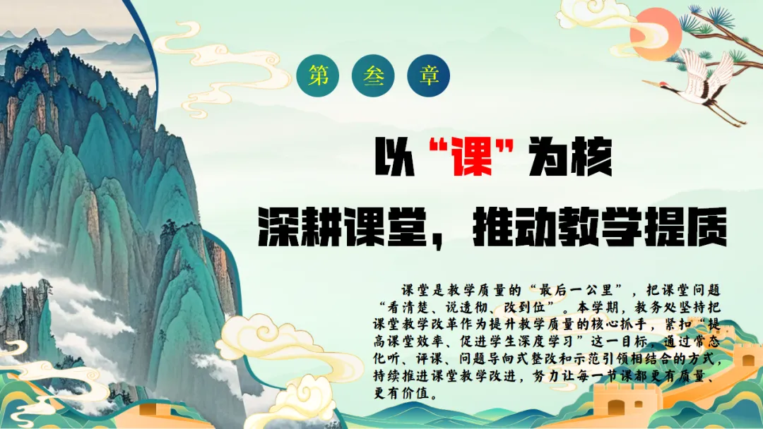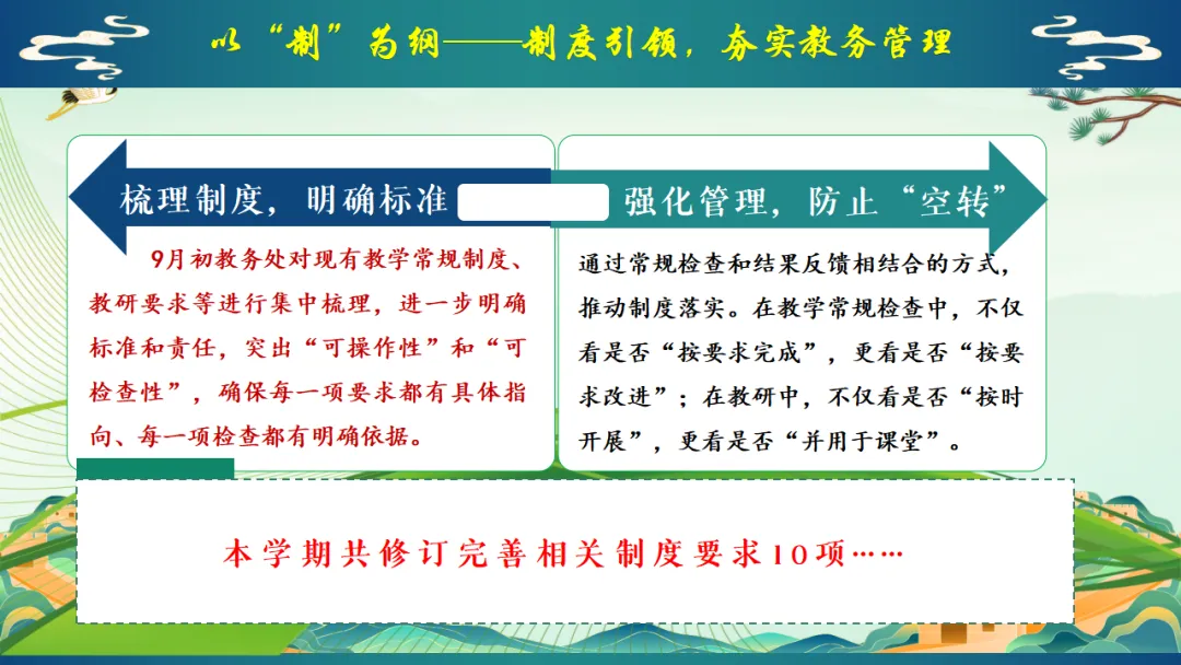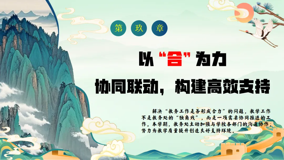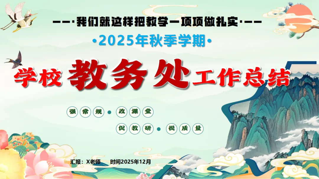 2025年秋季学校教务处工作总结:我们就这样把教学一项项做扎实,ppt共29页(ppt课件获取方式见文末) 以"进"为目标,总结经验,解决 "下一步往哪里走"的问题,回顾2025年秋季学期,学校教学工作在规范中运行,在改进中提升.教务处将在已有基础上,继续聚焦课堂,聚焦教师,聚焦质量,持续推进教学管理精细化.下一阶段,教务处将进一步强化课堂教学质量提升作为核心任务,在深化改革,优化管理、促进教师发展等方面持续发力,为学校教育教学高质量发展提供坚实保障,