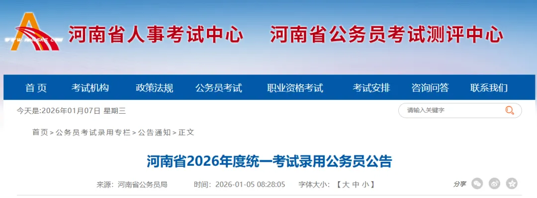 河南省2026年度统一考试录用公务员工作专用网站为河南省人事考试中心网站(http://www.hnrsks.com)。招考公告及与本次招考总体工作有关的信息和事项通过该网站发布。