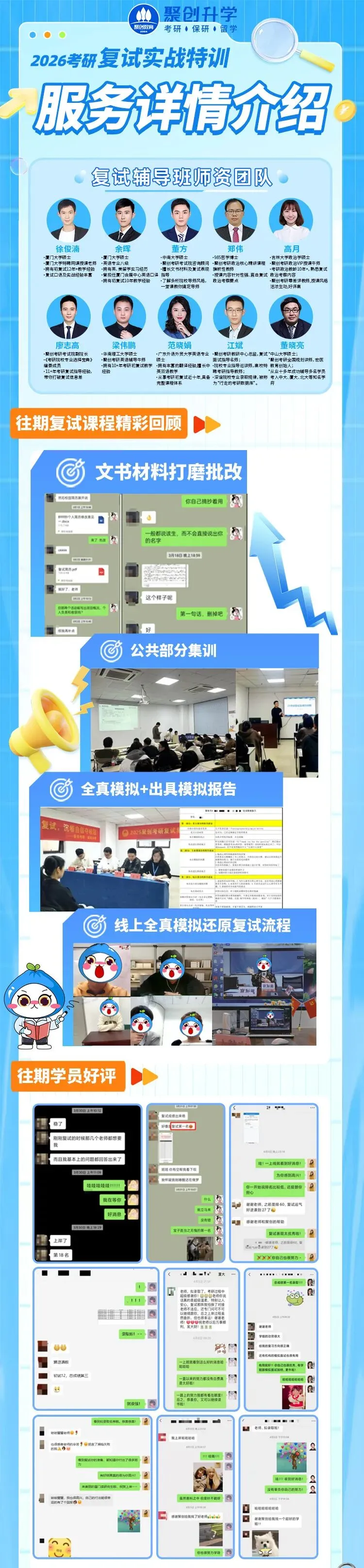 聚创考研也为大家准备了25考研复试指导课程!从复试简历文书撰写、材料证书准备到考研面试口语、专业课问答,统统一网打尽!你只管努力,聚创为你承担风险!