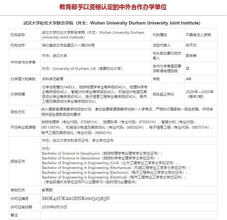 获批文件中湖北地区最受瞩目的,当属“武汉大学杜伦大学联合学院”的设立,它也是本次湖北唯一获批的中外合作办学机构。将开设地球物理学、地理科学、智慧水利、机械设计制造及其自动化、电子信息工程、电气工程及其自动化这6个专业。