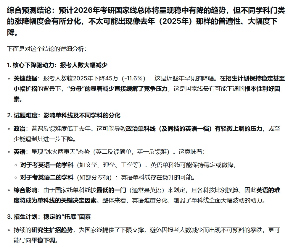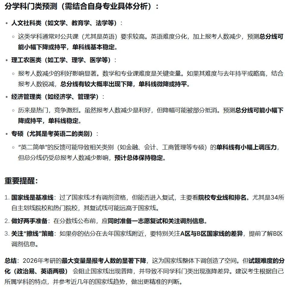 国家线的划定是相关部门在综合考虑招生计划、考生考试成绩、区域均衡发展、民族政策等情况下,按学科门类划定的,是全国硕士研究生招生考试考生进入复试的初试成绩基本要求。国家线是保证招生录取基本质量的底线,总体上充分保证各学科门类的招生需要,按照一定的比例划线,保证当年各学科上线人数不至于过多或过少。国家分数线包括总分线和单科线,只有两条分数线都过了,才有可能进入复试或者调剂(如果没过A区国家线但过了B区分数线就可以往B区调剂,这里说的是总分和单科都要过线)。关于国家线单科线,首先要说明的是,统考公共课的分数线不是划到具体学科上(英语、政治、数学这些),而是所有学科共用一条“单科线”,具体分为满分=100分(比如政治、英语)和满分>100分(比如数学150分或者其他学科统考比如教育、医学的300分)。这个分数线的划分是根据这些单科里最低的一门来确定的,比如说一般都是英语最难、分数最低,那么就以英语计算出的分数线为单科线,大于100分的科目按照比例扩大。2025年经济学英语单科线40分,那么大科满分150分的数学和专业课(满分150分是100分的1.5倍)国家线是40×1.5=60分(如果乘积有小数点,四舍五入为整数);再比如2025年历史学英语线43分,那么专业课满分300分的线就是43×3=129分,这个比例关系大家只要看一下往年分数线就能明白。①试题难易程度:换句话说就是考生的成绩是直接影响的国家线的划定因素之一。像去年考完试之后,政治、英语,全网几乎都在说难,几乎很少有说简单的,加上去年考研报考人数下降50万人,最终各个学科门类国家线普遍下降。下图给大家看下去年国家线的变动(与2024年国家线相比):而今年,政治这一门,考完试之后,据各平台考生的反映以及辅导老师的评价,整体难度应该低于上一年。英语考完试之后,话题“英二简单”和“英语一我恨你”上了热搜。当普遍都说难,几乎没有人说简单的时候,是真的难,大家普遍都考的不好;但是,当有一部分人说难,而有不少人说简单的时候,可能难度没那么高。那么国家线的变动可能就不会像去年那样全面大幅下降。相较25考研人数(388万)下降了45万人之多,降幅达到了11.6%,超过去年的降幅11.4%小五姐把以上信息提供给deepseek,得到的分析如下(本文主要科普分数线,以下理性看待):国家线就像开盲盒,在没有公布之前,谁也无法准确预测,不过看完以上分析,大家可以不用太过于焦虑,过线大有希望!值得期待!教育部根据全国不同地区经济发展情况和教育水平等,把全国31个省市自治区分为两类,分别为一区和二区。