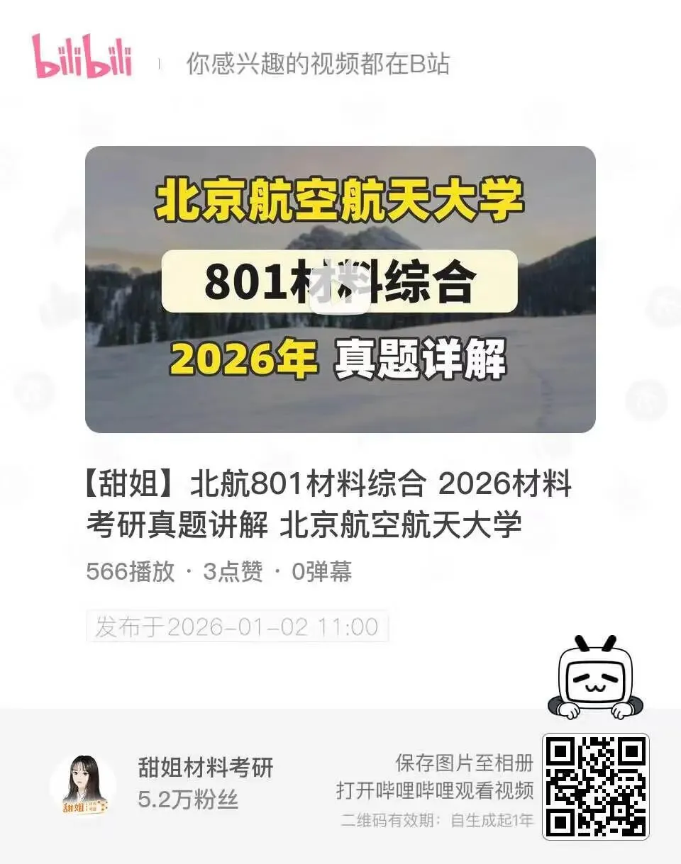 在我的B站账号【甜姐材料考研】有北京航空航天大学801材料综合估分直播回放,大家可以扫码观看。