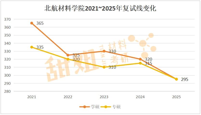 北航材料学硕和专硕近五年的复试线均呈现下降的趋势。在21-24年,学硕的复试线一直是高于专硕的,但是25年学硕专硕复试线都降到295分。