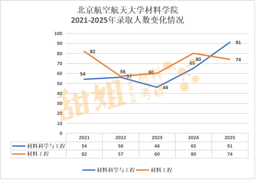 近五年中,除了23年和25年,北航材料学硕的录取人数一直是高于专硕的,23年专硕仅多1人,但是到了25年专硕录取人数达到了91人,为近五年最多,比学硕多录取了十几人。
