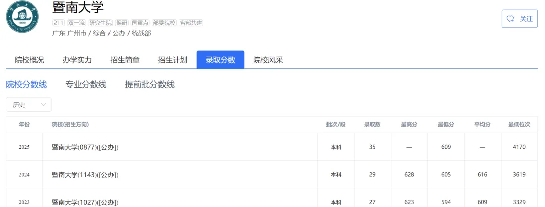 志愿填报|暨南大学2025年在河北省录取分数线及排名(物理、历史)