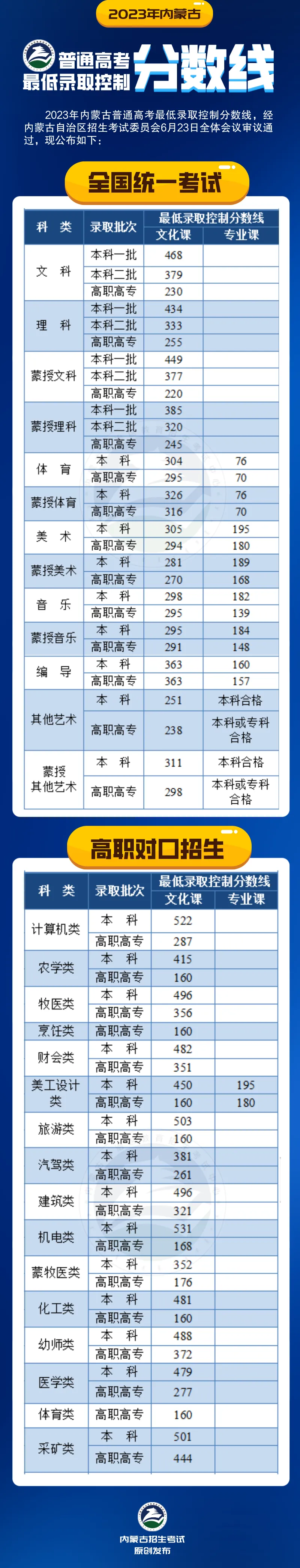 >2023年内蒙古普通高考最低录取控制分数线公告