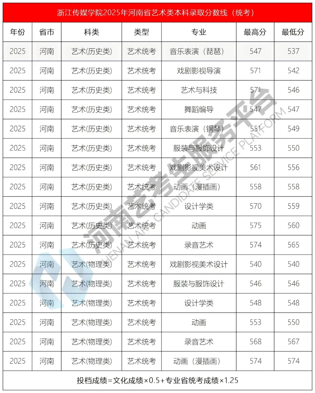 浙江传媒学院2025年河南省艺术类本科录取分数线(统考)