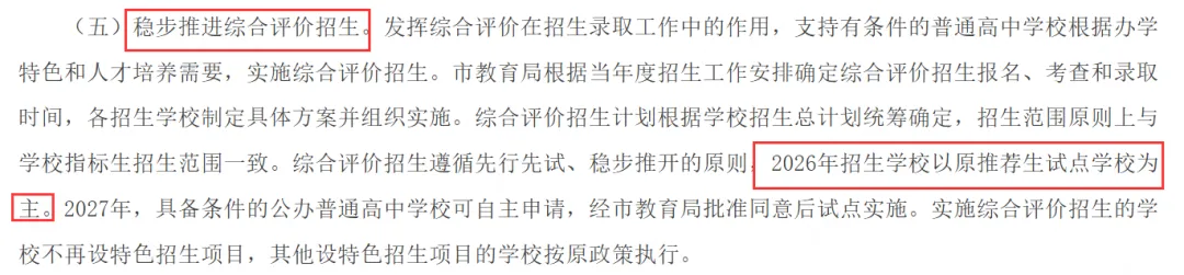 试点范围:以原推荐生试点学校为核心,率先开展 “综合评价招生”,2027 年具备条件的公办高中可自主申请加入;