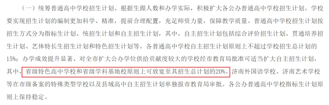 普通高中:自主招生计划仍不超过总计划的 15%;