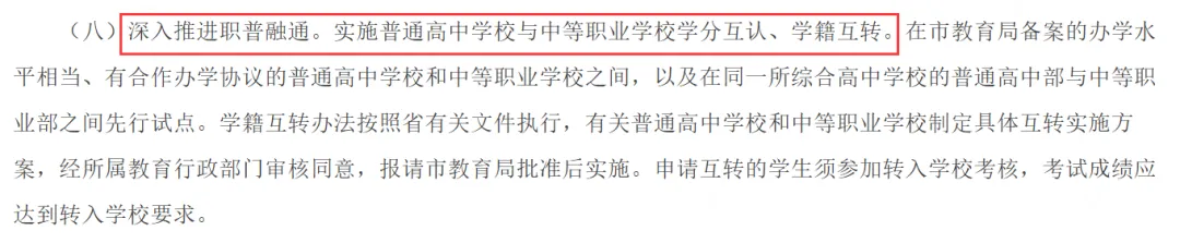 试点范围:在市教育局备案、办学水平相当的普高与中职学校之间,或同一所综合高中的 “普高部” 与 “中职部” 之间,试点 “学分互认、学籍互转”;