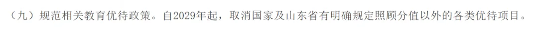 明确自 2029 年起,取消国家及山东省规定以外的所有优待项目,仅保留省级以上明确的加分政策(如少数民族考生、归侨子女加分)。