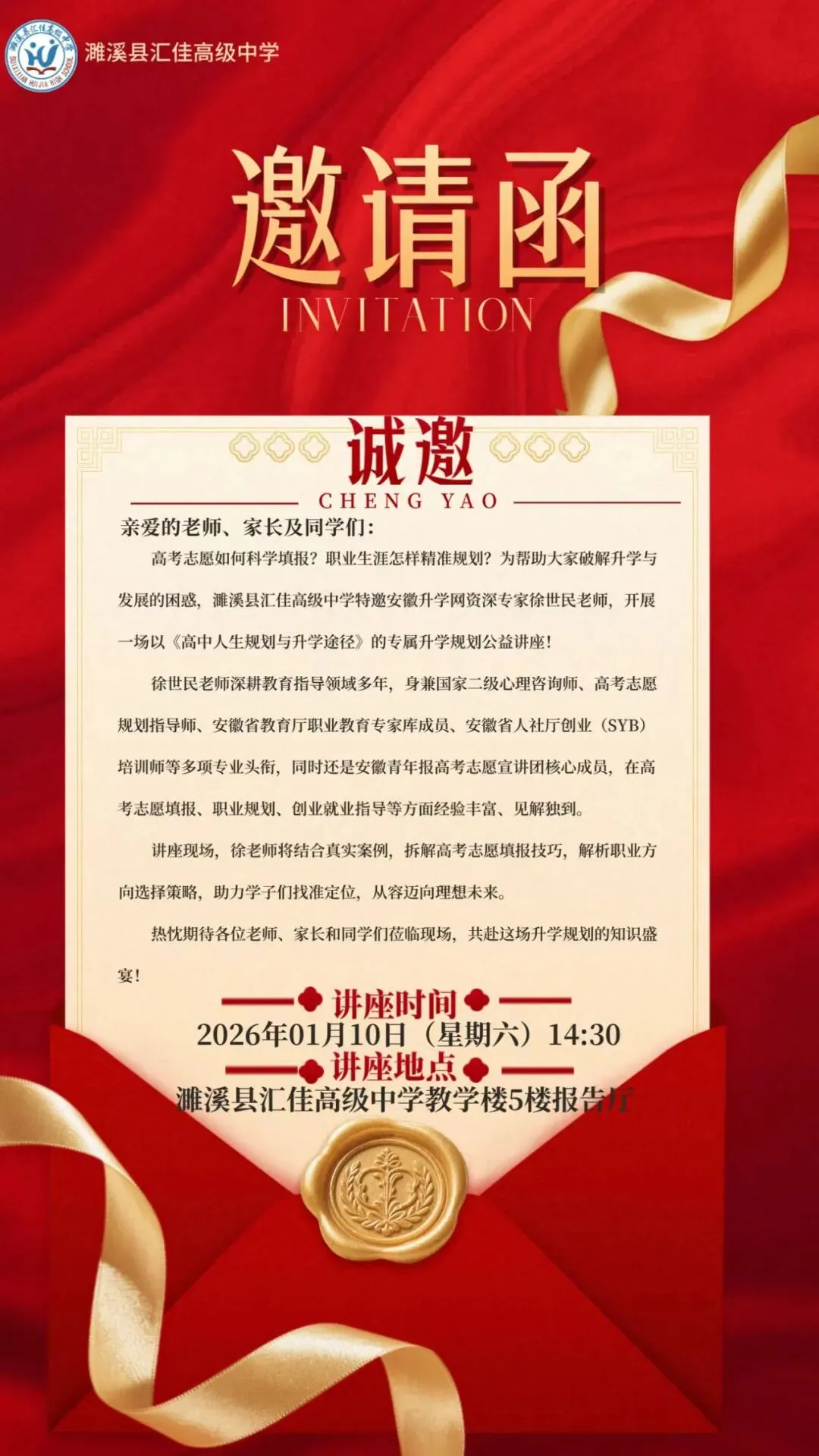 邀请函 | 诚邀聆听《高中人生规划与升学途径》升学规划公益讲座,助力学子逐梦远航