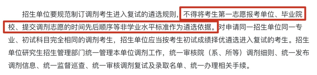 统一调剂信息发布平台:各高校都需在研招网的“全国硕士研究生招生考试复试调剂”板块发布;*图源研招网:2025年研招规定统一调剂正式开始时间:从4月8日起,不得“抢跑”;二、不得将非学业水平作为遴选依据招生单位要规范制订调剂考生进入复试的遴选规则,不得将考生第一志愿报考单位、毕业院校、提交调剂志愿的时间先后顺序等非学业水平标准作为遴选依据。